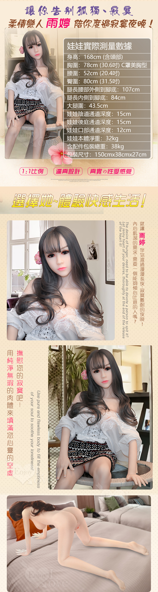 使用部位:陰交、肛交、口交、乳交四種性交用法,內置合金骨骼可固定姿勢,關節可動,可隨意變更姿勢
