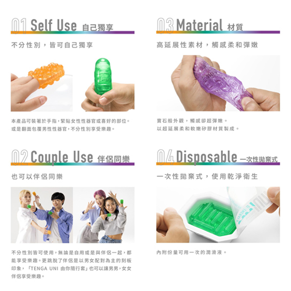 TENGA UNI (テンガ ユニ )は、ぷるぷるのストレッチ素材で作られているので、指にはめて女性器にあてたり、ひっくり返して男性器を包んだり、自由な使い方で楽しめます。また、ひとりで楽しむだけでなく、パートナーのために使うこともできる、ユニセックス & ユニバーサル 設計のまったく新しいTENGA です。