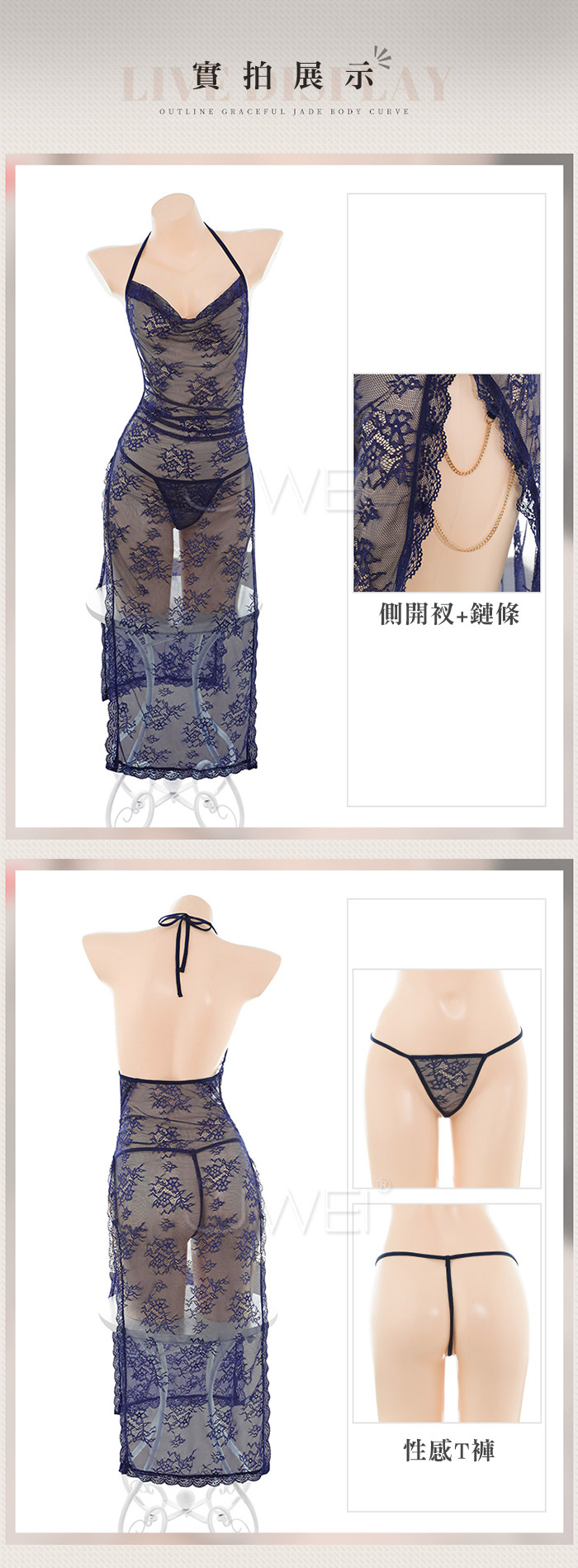| 柔媚御姐.藍海灣純欲蕾絲蕩領 美背半露兩側開衩透視睡裙【連衣裙+T褲】