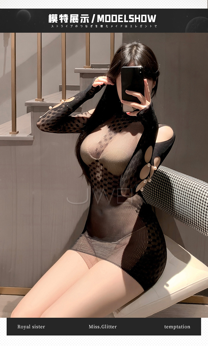 ►您現在的位置:首頁>鄰家姐姐.高智感珍珠飾側鏤空長袖半高領包臀連身網衣-黑【單件網衣】