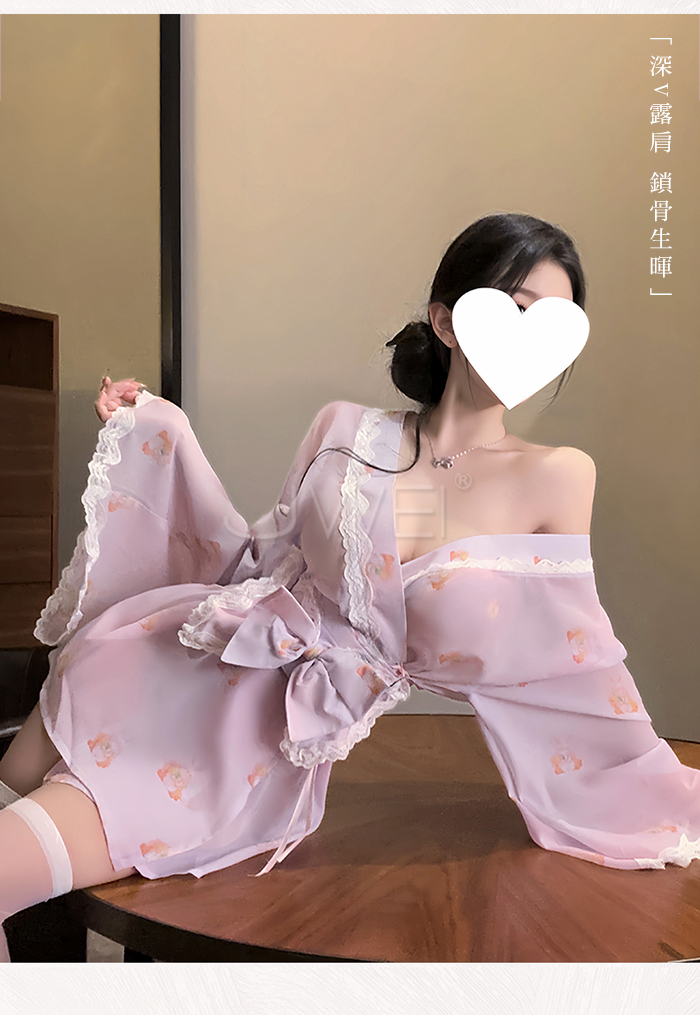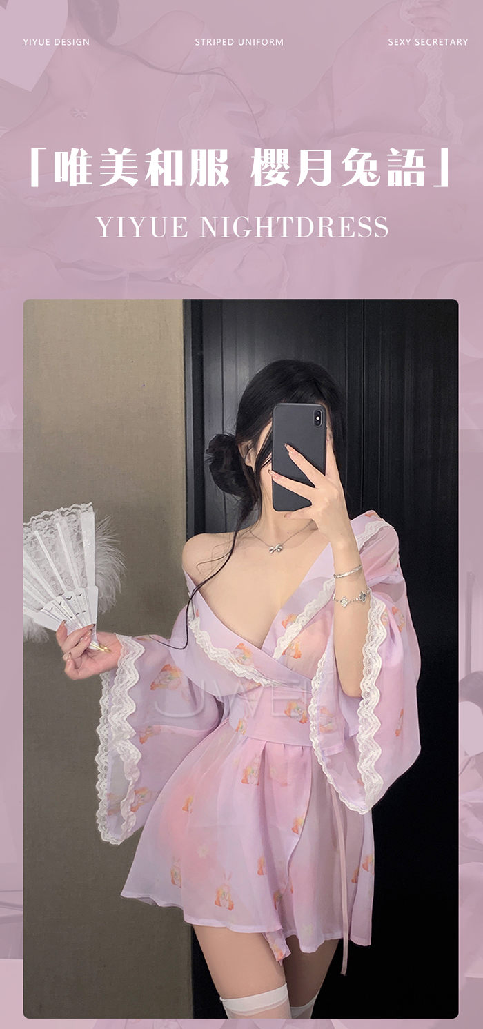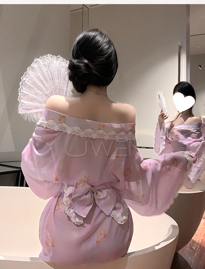 ►您現在的位置:首頁>櫻月兔語.蕾絲滾邊露肩領口可愛兔子印花日系和服套裝【和服+蝴蝶結腰封】
