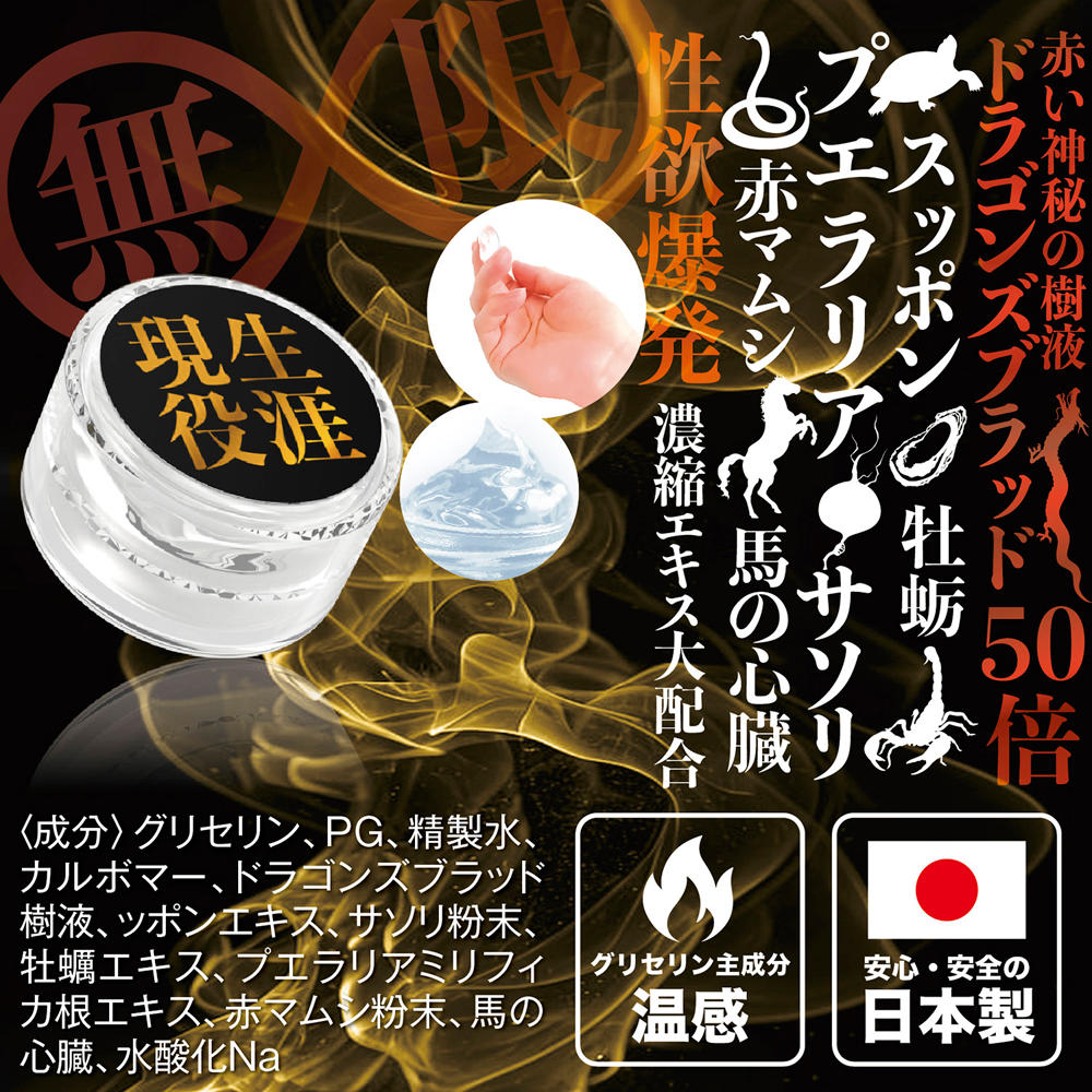 成分:甘油、丙二醇、純水、卡波姆、龍血樹液、甲魚萃取物、蠍子粉末、牡蠣萃取物、葛根萃取物、赤紅蝮蛇粉末、馬心臟、氫氧化鈉