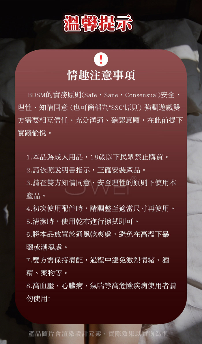 ■SM用品屬於特殊情趣用品,需在雙方清醒自願的情況下使用, 該物品僅作為情趣用品使用,使用時應注意安全!!