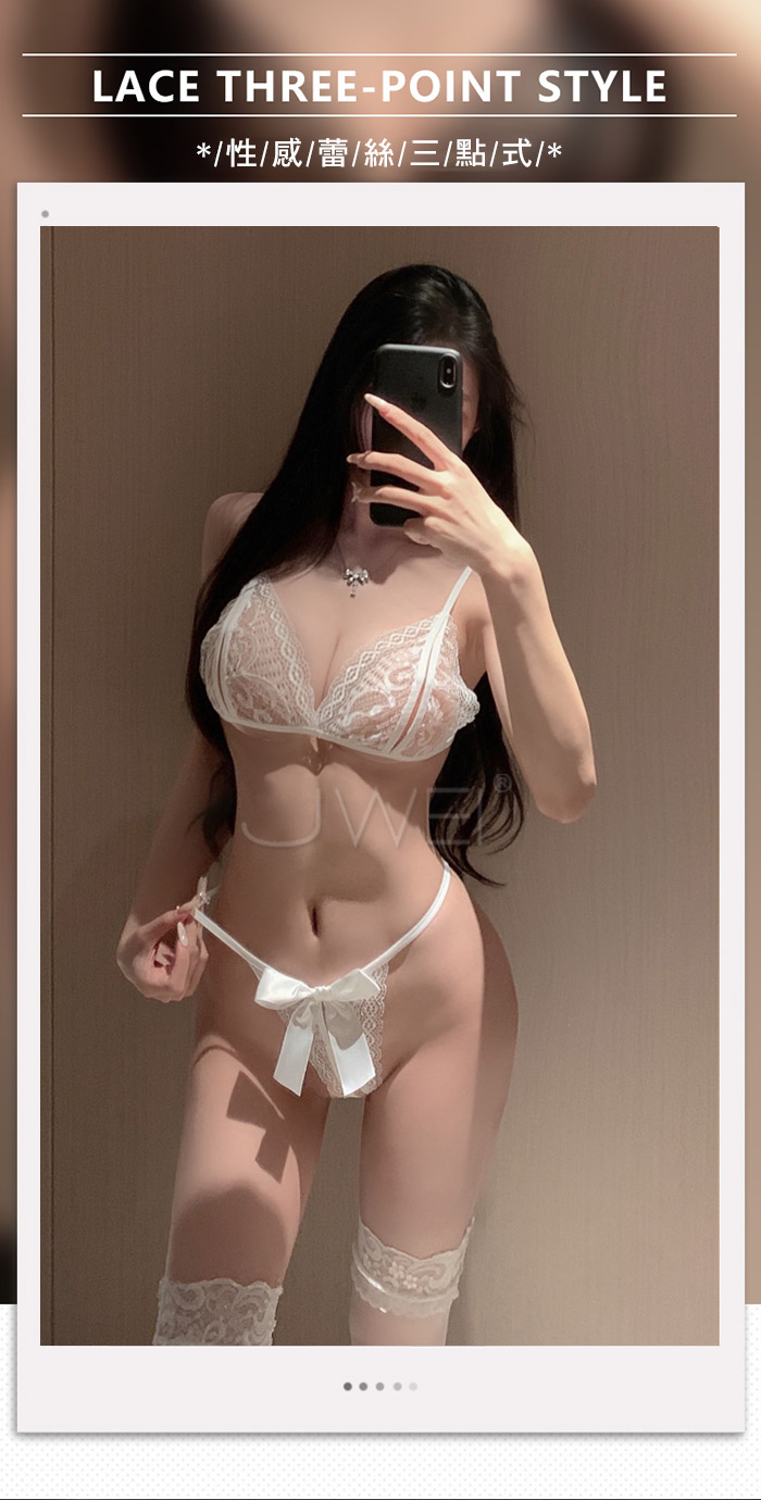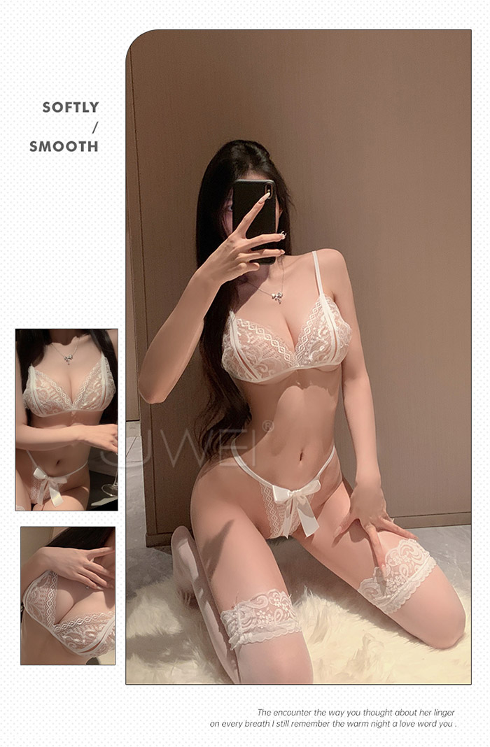 嫵媚佳人.性感蕾絲透視開縫胸罩+蝴蝶結開襠丁字褲【白色】
