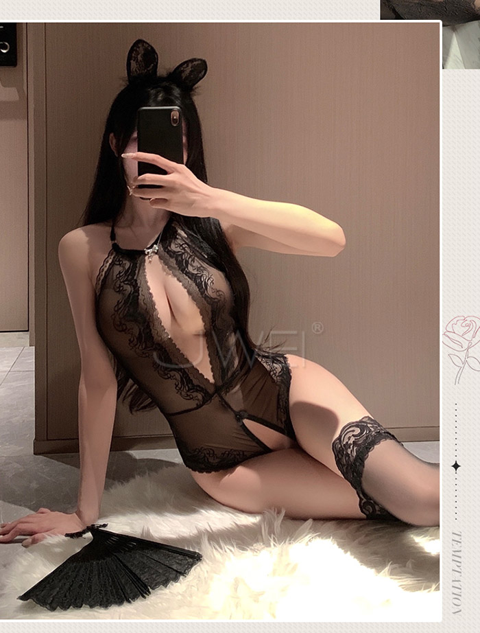 喚慾花靡.火辣開胸花蔓薄紗透視美背連體衣【黑色】