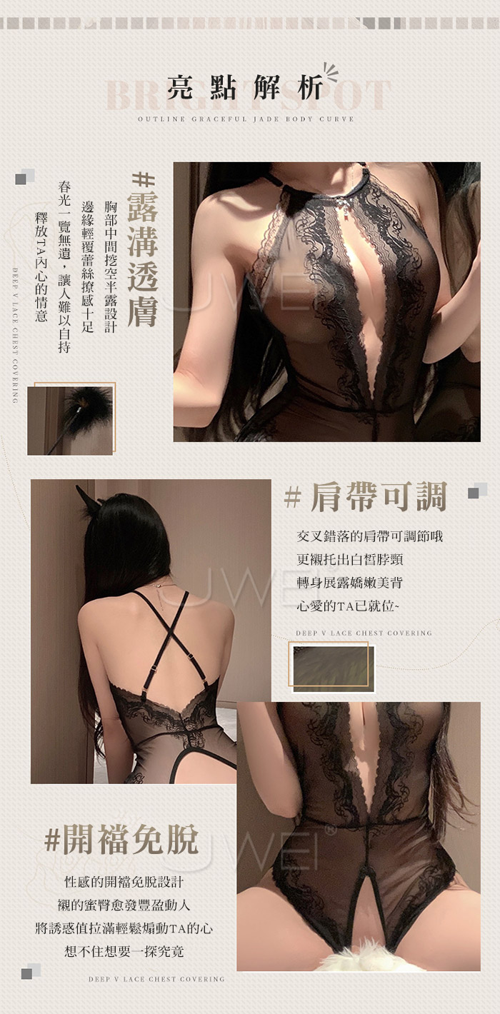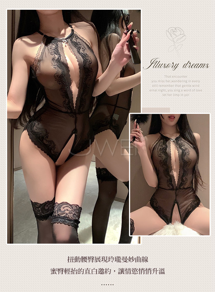純愛戀人.蕾絲半露胸網紗美背開襠連體衣【黑色】