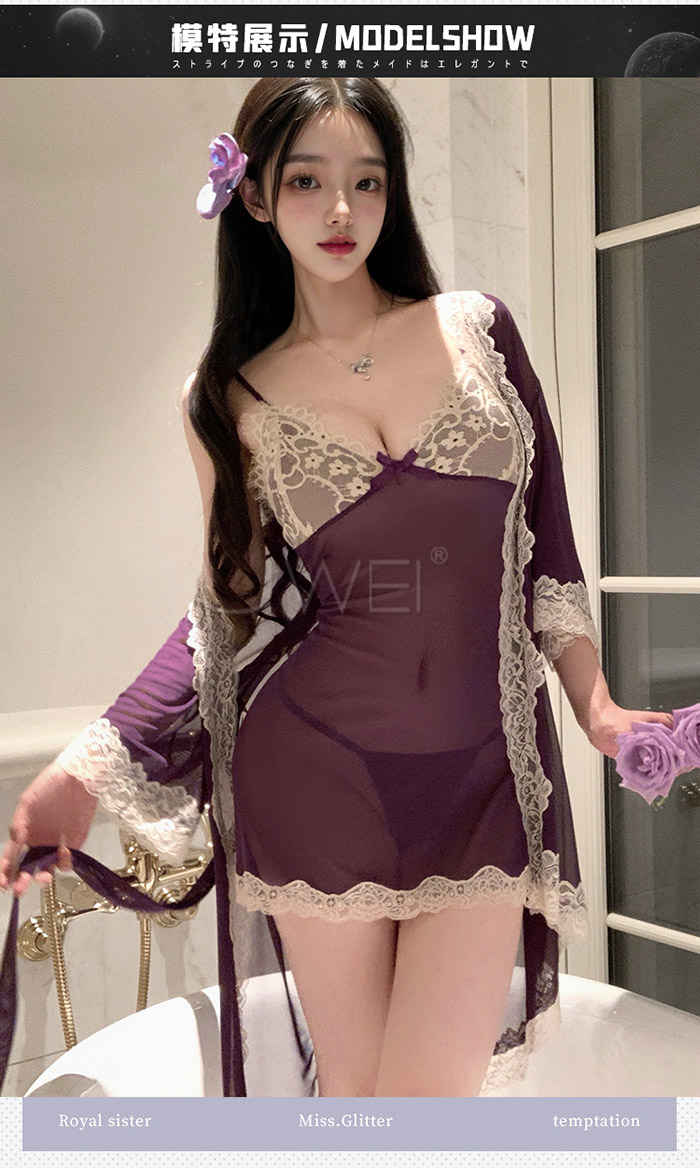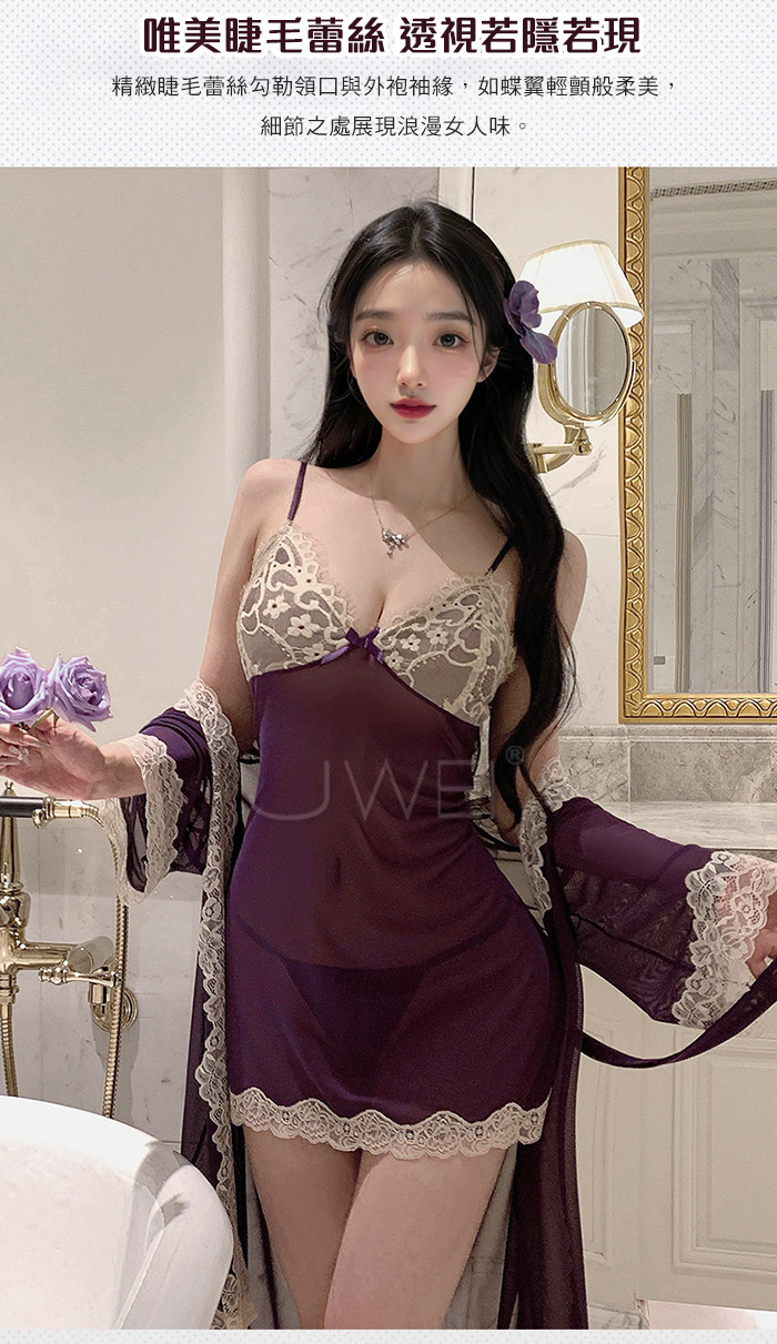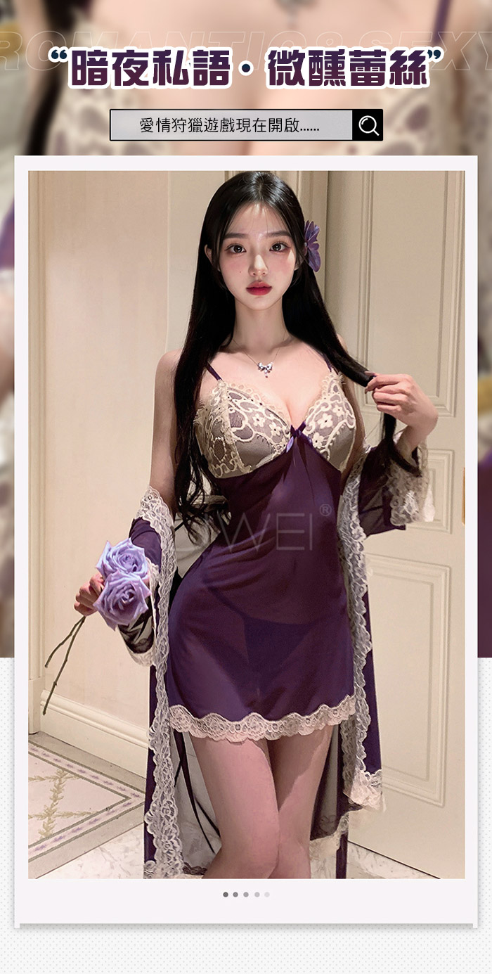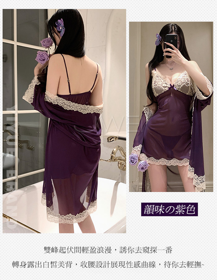 微醺蕾絲.性感深V露溝睫毛蕾絲覆胸美背睡裙-紫色【外袍+睡裙+T褲】