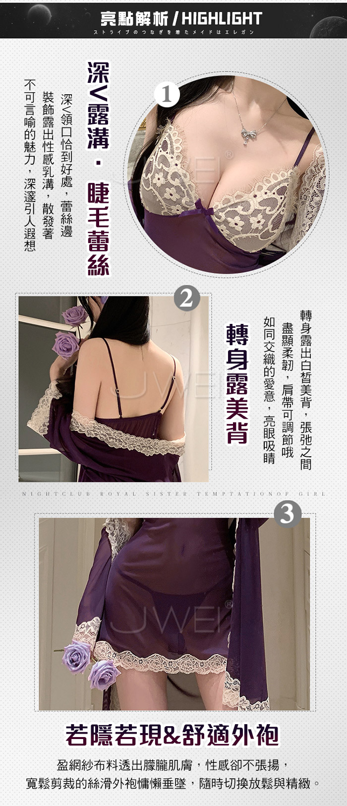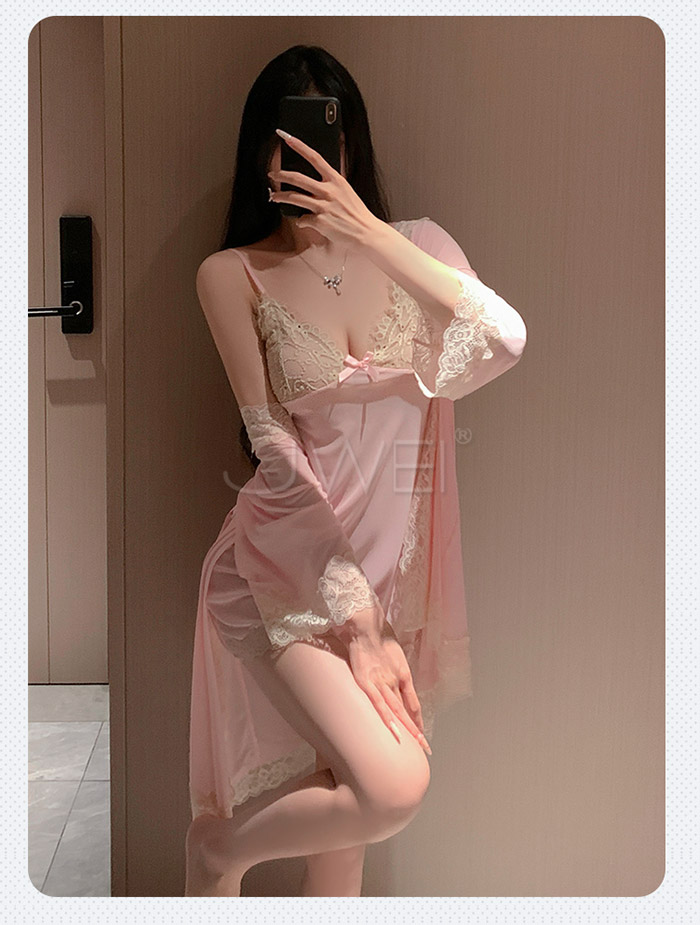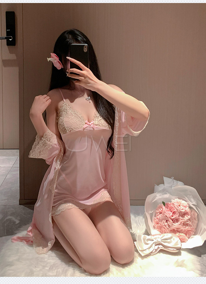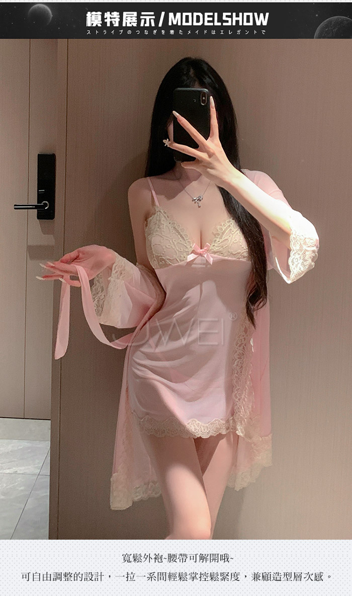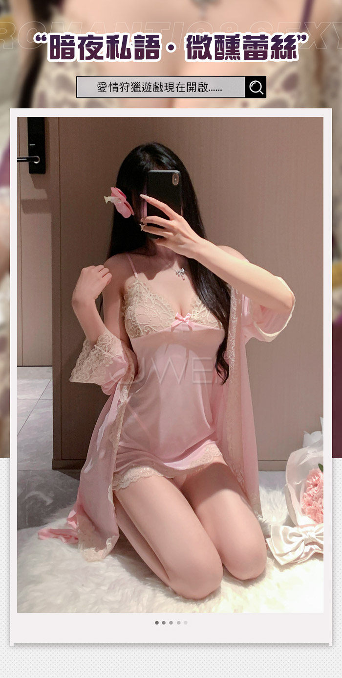►您現在的位置:首頁>微醺蕾絲.性感深V露溝睫毛蕾絲覆胸美背睡裙-粉色【外袍+睡裙+T褲】