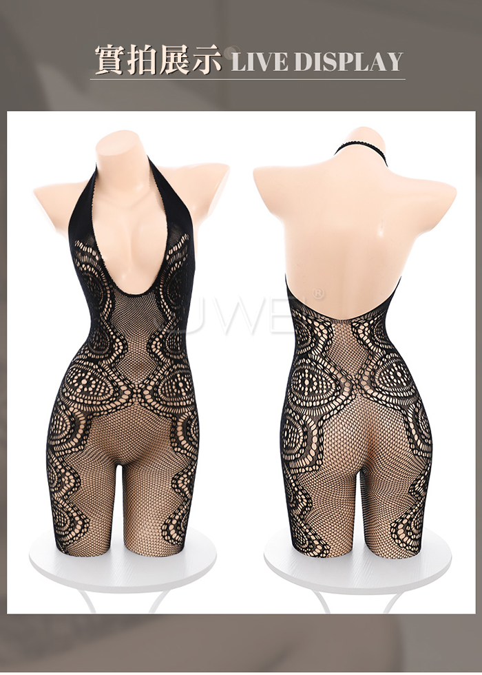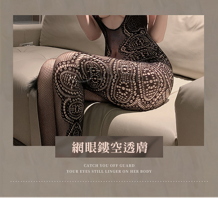 魅魔の眼.心機掛脖深U網眼緹花鏤空透膚連身貓裝