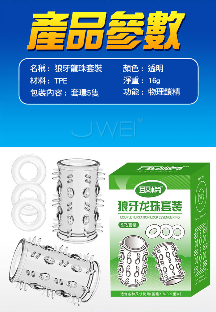 首頁>取悅 狼牙龍珠.顆粒刺激降敏加時高彈鎖精套環【5入裝】