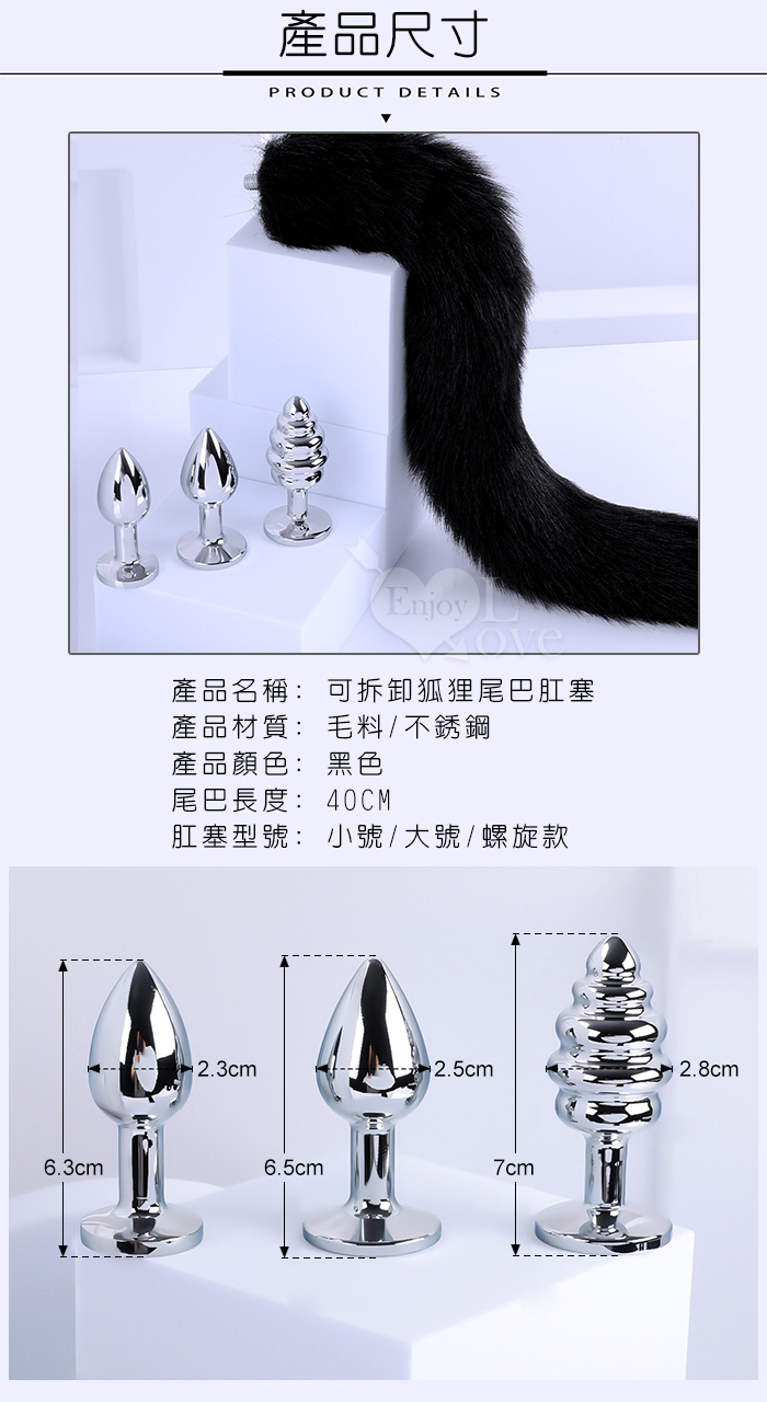 激性扮演狐狸精 ‧ 3款不銹鋼後庭肛塞+純黑尾巴毛套裝組﹝可組裝拆卸﹞