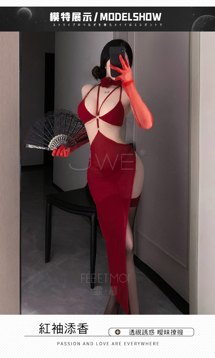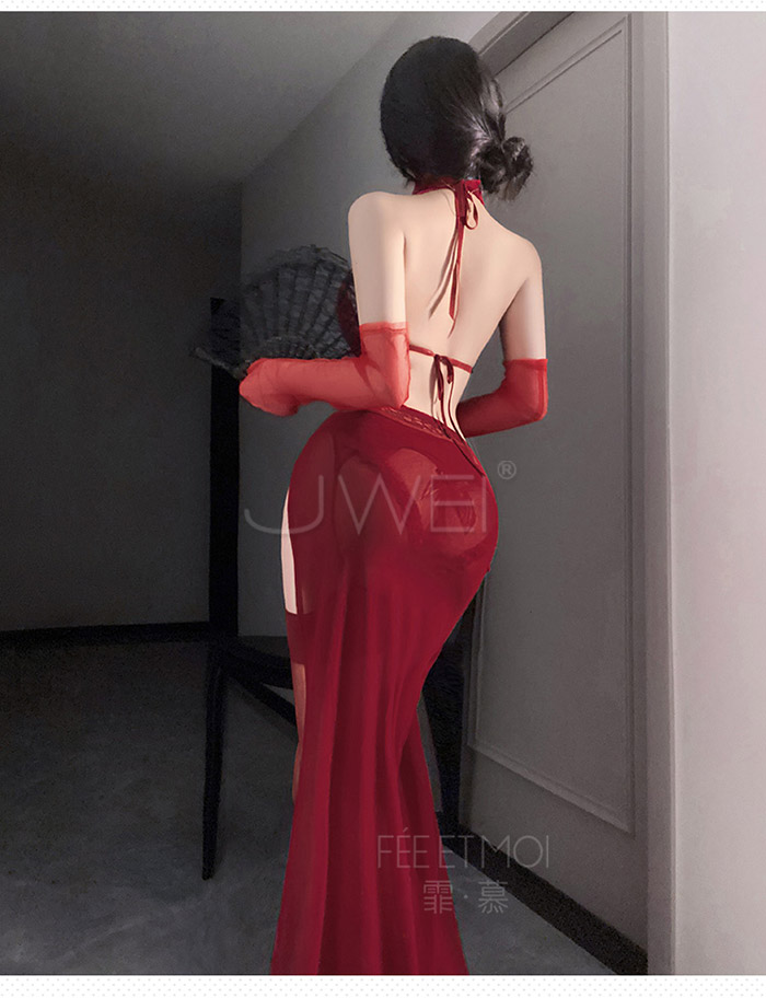 蝶夢縈懷.性感挖空露溝開衩交叉綁帶美背古韻鏤空旗袍【旗袍+T褲】