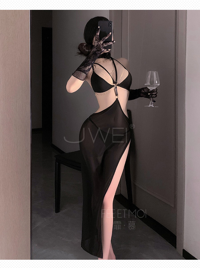 雙色嬌妻.迷迭花樣掛脖頸環美背側高衩網紗睡裙-黑【頸環+連身裙+內褲】