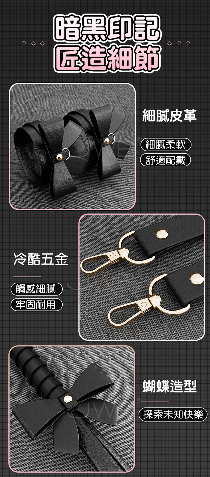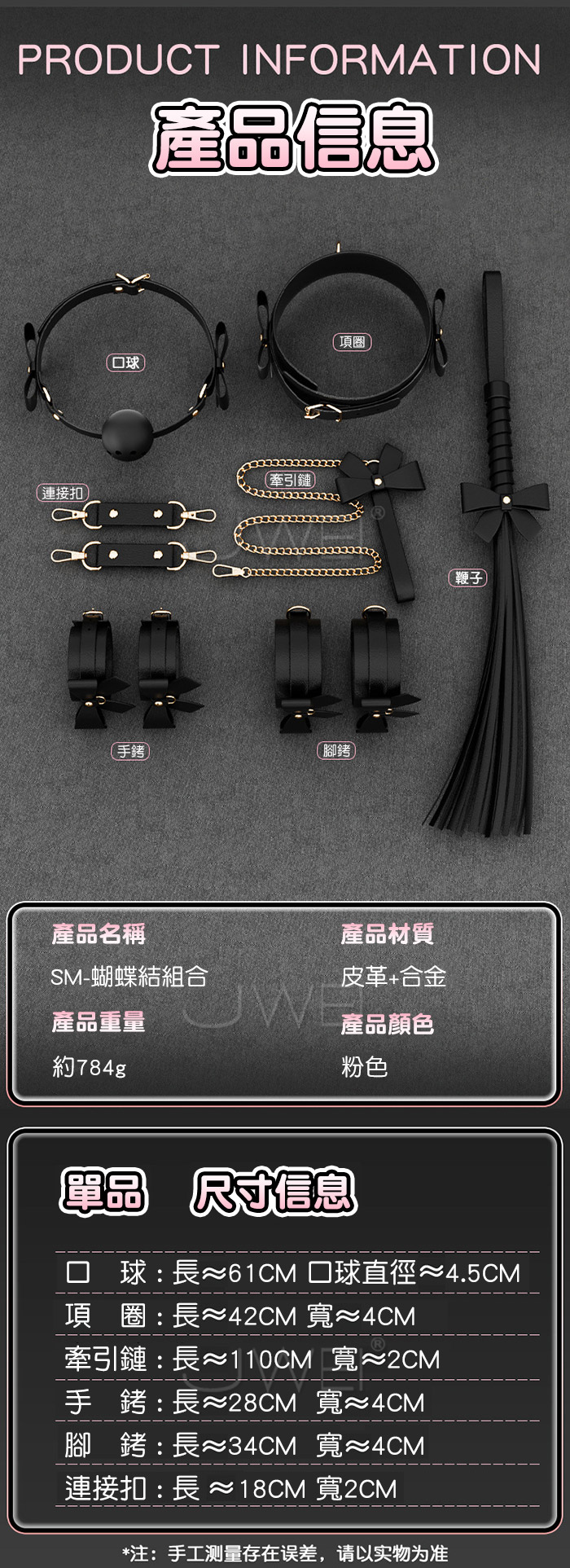 黑蝴蝶套裝-一套關於愛與被愛的道具,皮質與束縛的情趣碰撞 精選皮革 耐磨耐拉扯,精細紋理/順滑手感 優雅鎖扣/鎖定牢固,打磨切割/工藝製作 產品規格 ■尺寸:大小詳如圖片標示 ■材質:合金、皮革 ■特色:增進情趣 ■SM用品屬於特殊情趣用品,需在雙方清醒自願的情況下使用, 該物品僅作為情趣用品使用,使用時應注意安全!!