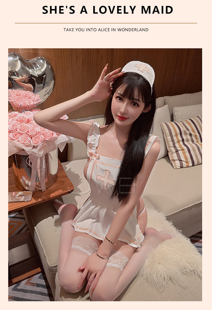 ►您現在的位置:首頁>誘慾診療.荷葉花邊吊帶圍裙綁帶美背私房護士誘惑套裝【髪箍+圍裙+T褲】