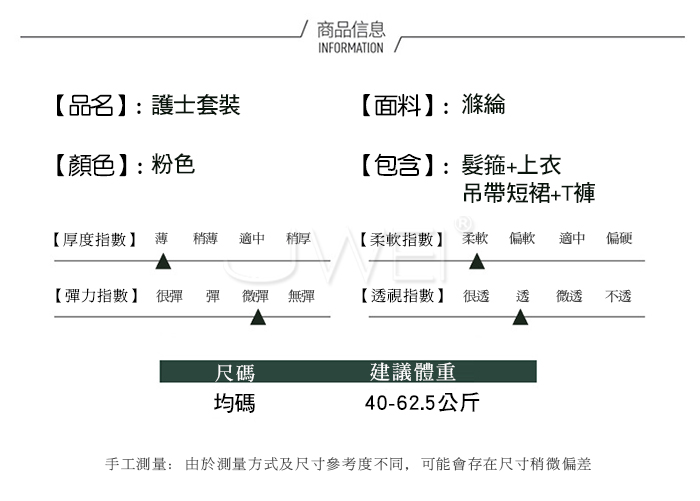 ■內容物:髮箍+上衣+吊帶短裙+T褲 ■適穿尺寸:FREESIZE ■彈性:有 ■未撐開平量尺寸正負誤差1~2cm,1吋=2.54cm ■注意事項:基於保障消費者個人衛生,此貼身衣物恕不接受退換貨。 (如為商品本身暇疵,接受七日內換貨,請勿試穿,謝謝您)