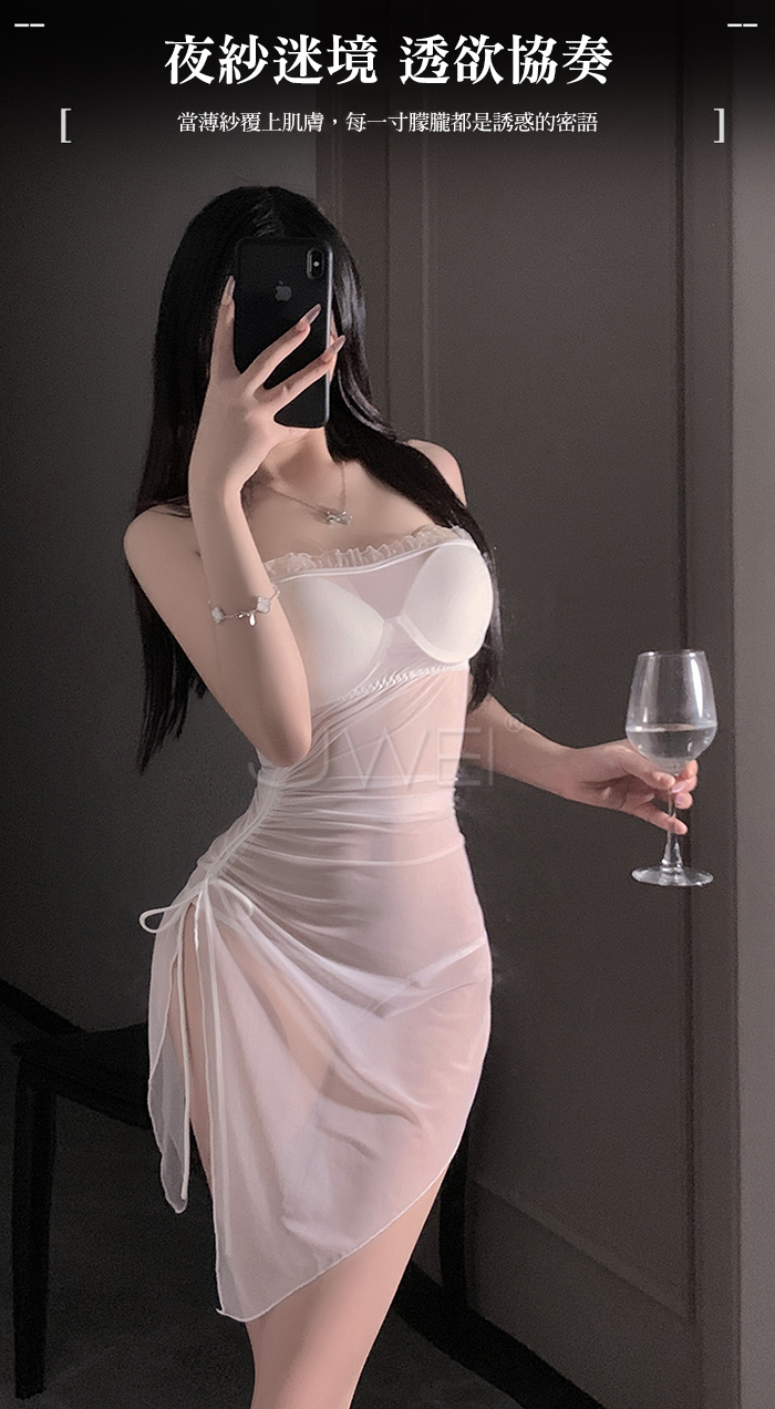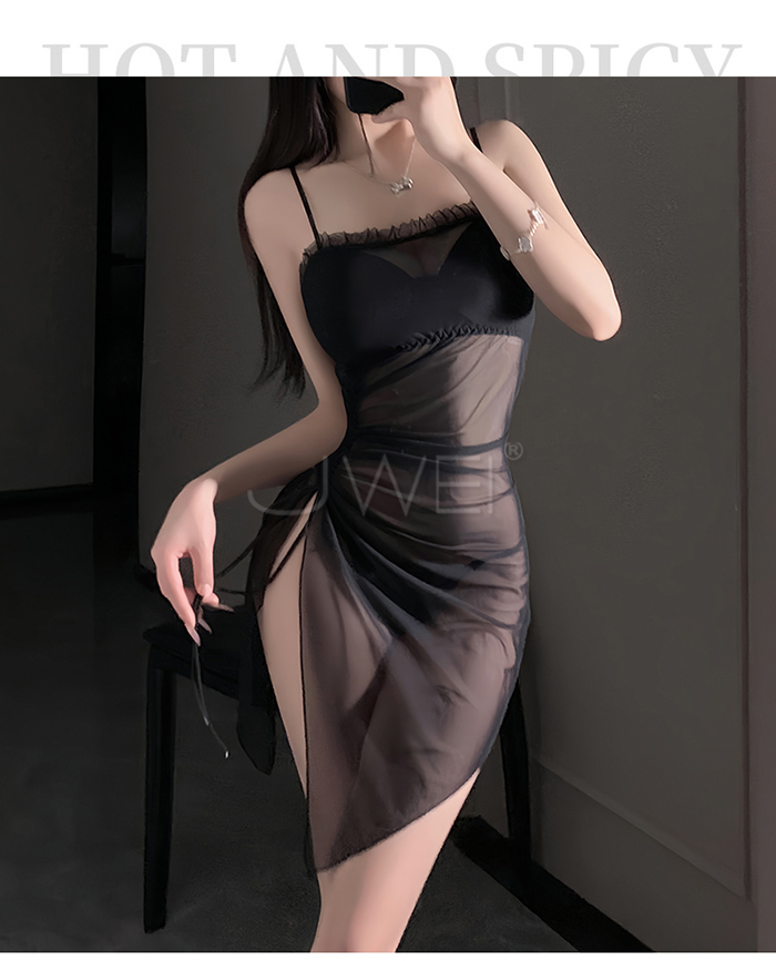 | 夜紗迷境.韻味透紗木耳邊飾側開衩抽褶收腰睡裙【睡裙+T褲-黑色】