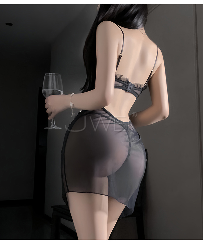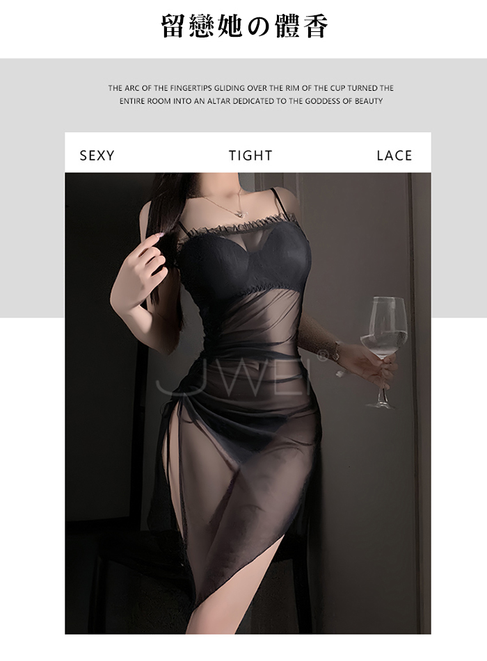 ►您現在的位置:首頁>夜紗迷境.韻味透紗木耳邊飾側開衩抽褶收腰睡裙【睡裙+T褲-黑色】