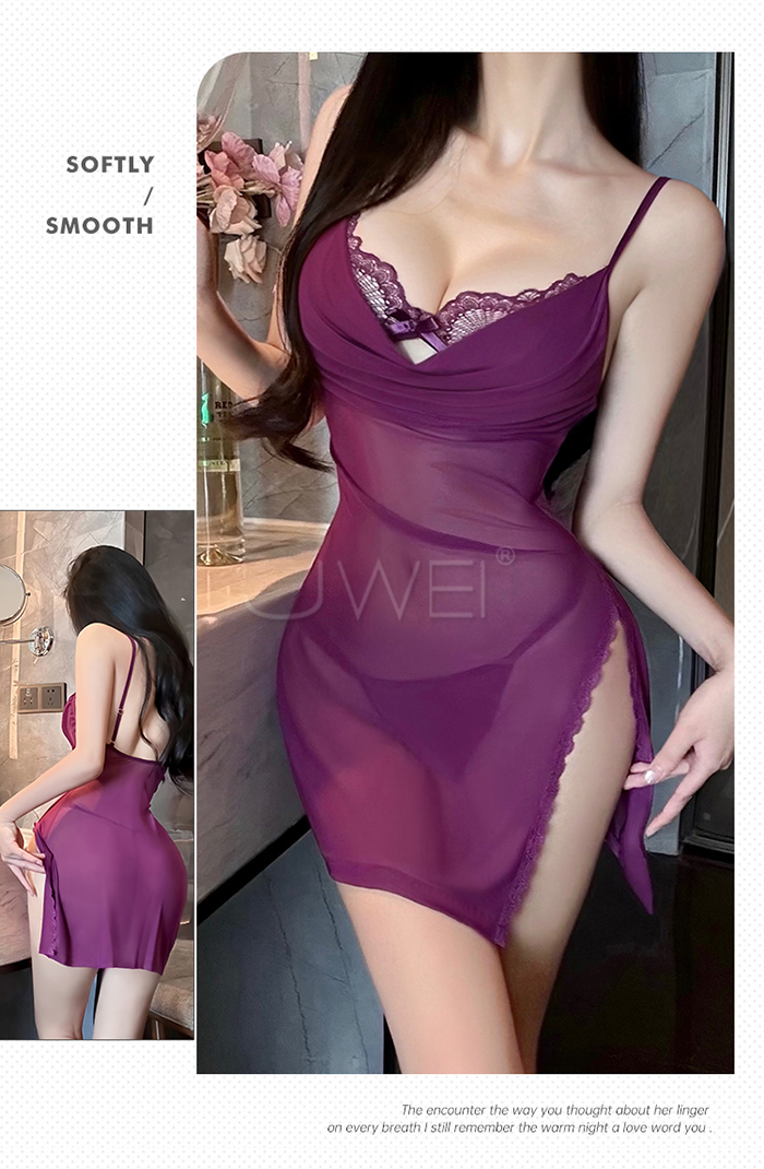 | 月暮迷紗.性感裸紗蕩領透視側開衩細肩帶美背睡裙【睡裙+T褲-紫色】