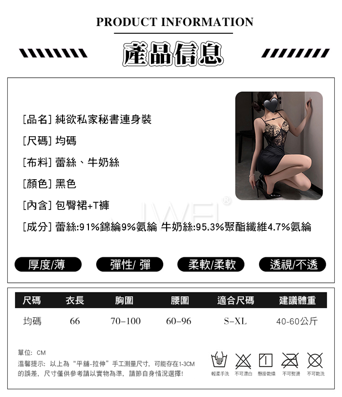 ■內容物:包臀裙+T褲 ■適穿尺寸:FREESIZE ■彈性:彈 ■未撐開平量尺寸正負誤差1~2cm,1吋=2.54cm ■注意事項:基於保障消費者個人衛生,此貼身衣物恕不接受退換貨。 (如為商品本身暇疵,接受七日內換貨,請勿試穿,謝謝您)