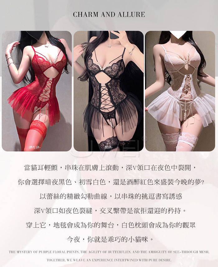 ►您現在的位置:首頁>串珠織夢.深V珍珠飾胸蕾絲繫帶花邊裙擺開襠連體衣【白色】