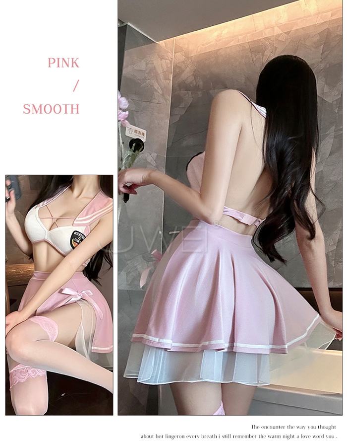 | 甜心刑警.胸前交叉繫帶清純百褶透視白紗COS制服套裝【上衣+短裙-粉+白】