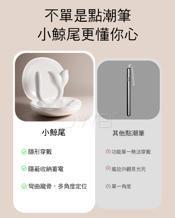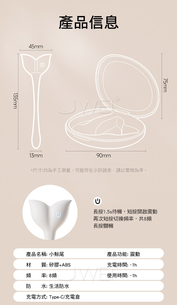 小鯨尾穿戴式的G點探索筆,可彎穿戴·智能遙控·隱形靜音 1.3cm直徑設計 輕鬆入體,內置可彎曲龍骨,精準點潮 8檔調頻 觸電般得綿密震感,15000/轉,更高轉速快感急速猛 產品規格 ■尺寸:大小詳如圖片標示 ■材質:矽膠+ABS ■功能:8頻震動、APP智控