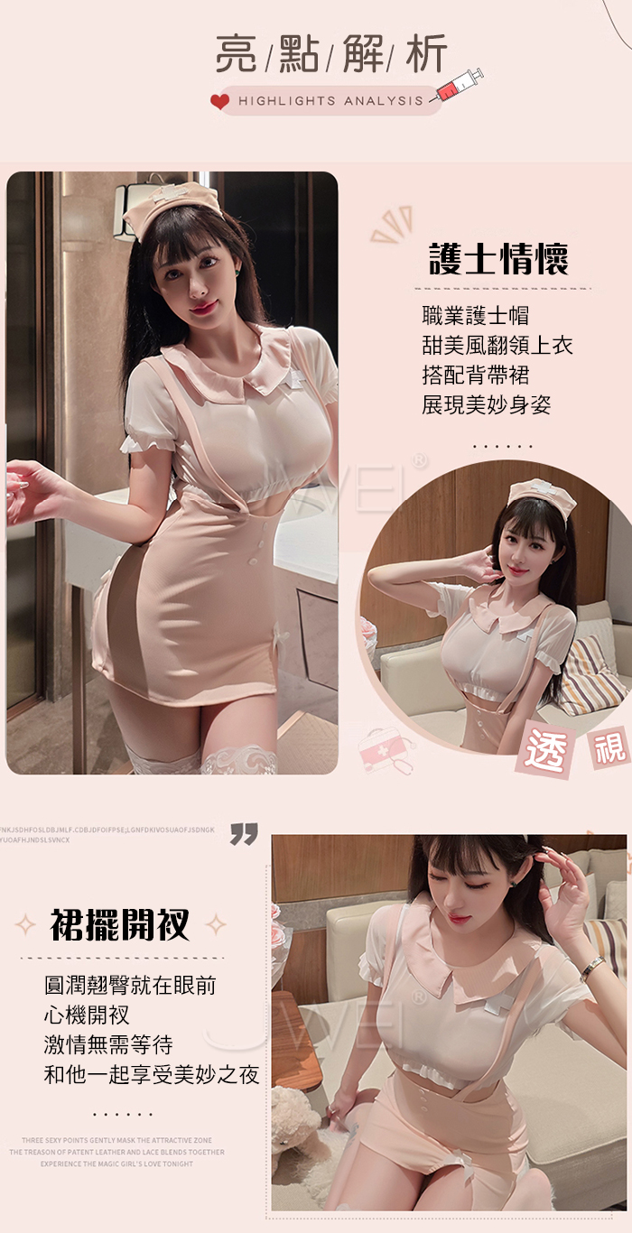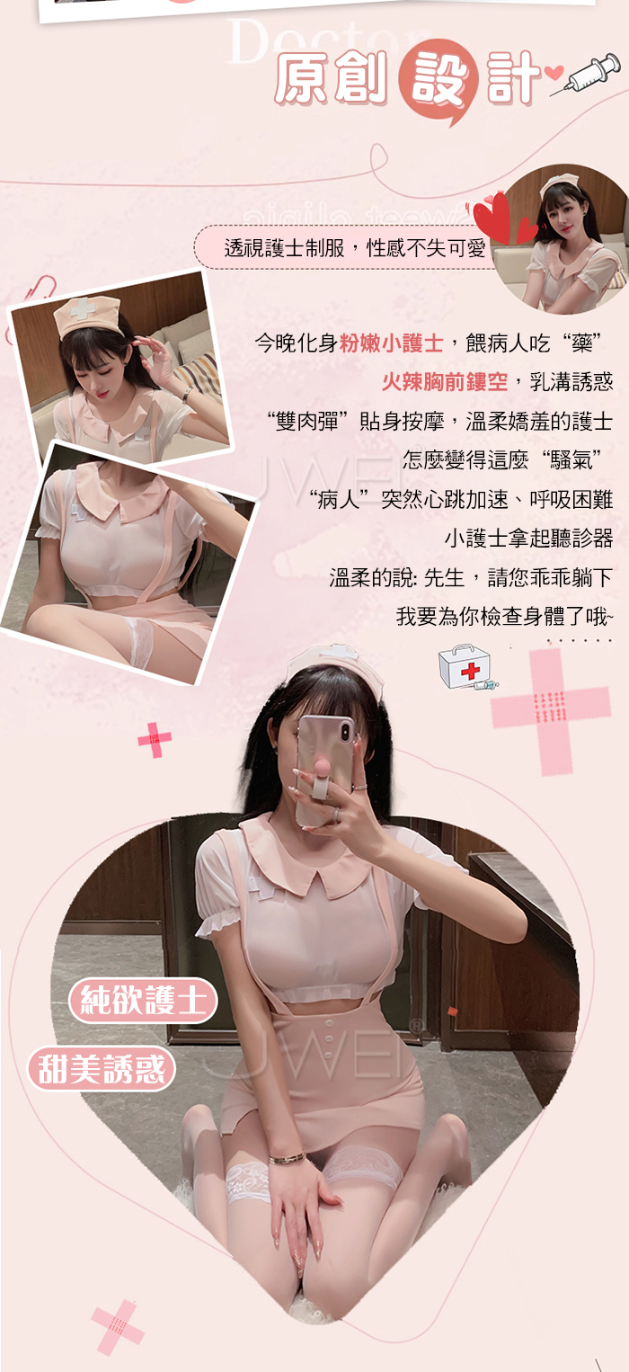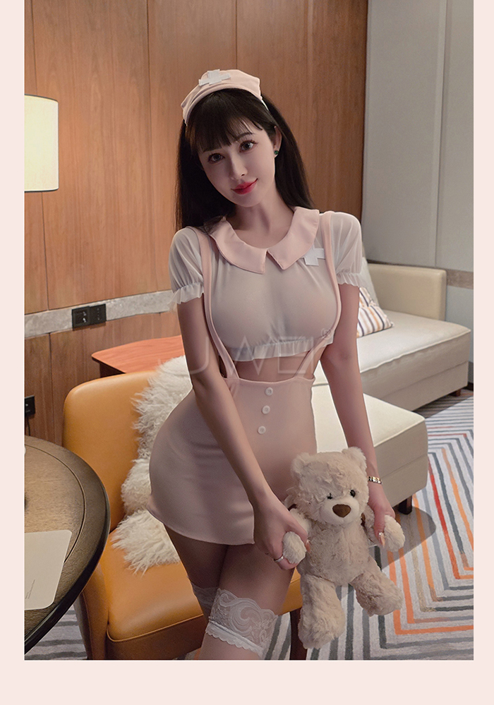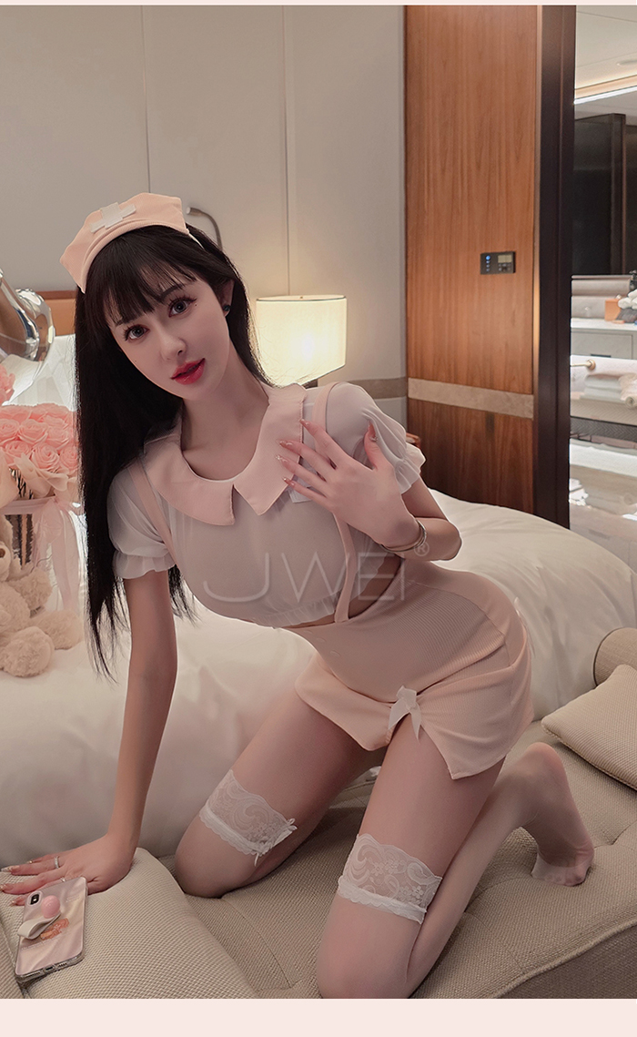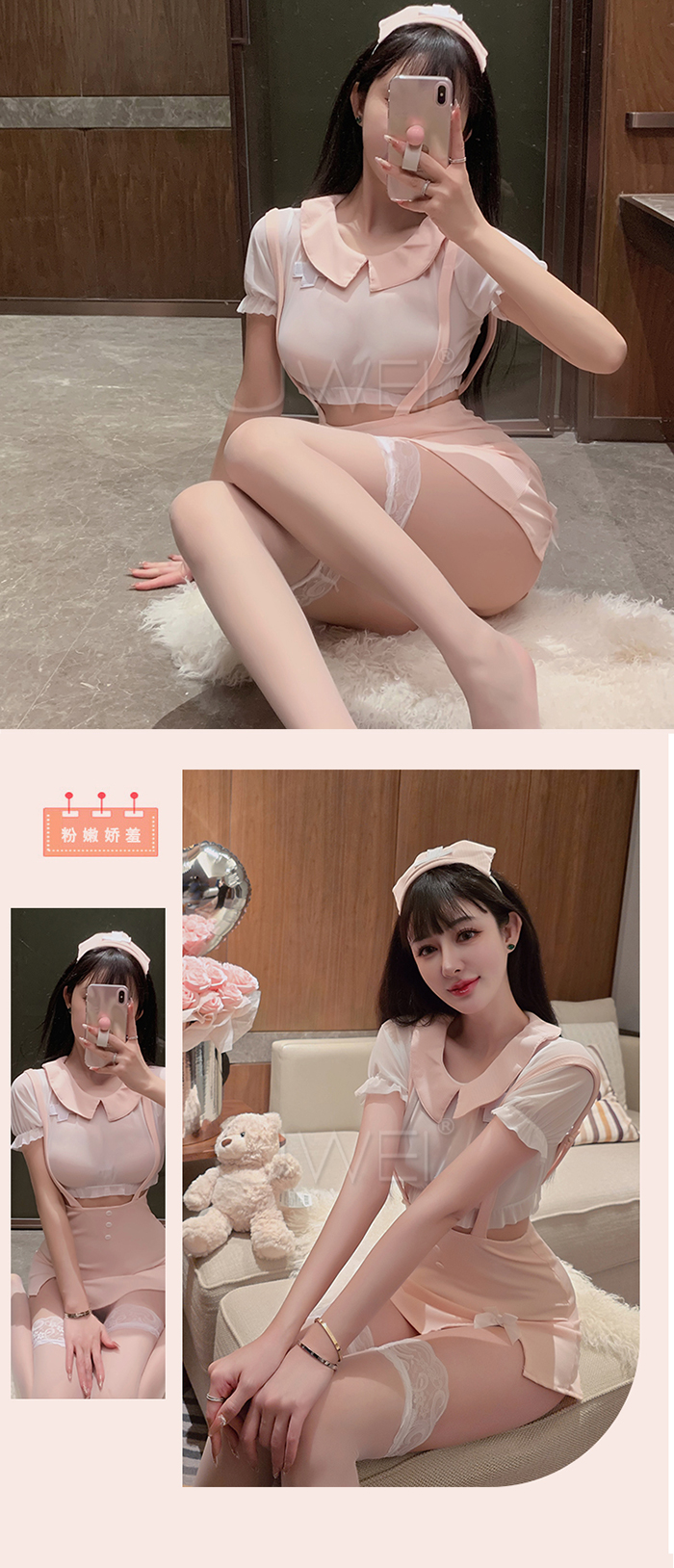 ►您現在的位置:首頁>糖心小護.火辣半透乳溝裙襬開衩小護士扮演服【髪箍 +上衣+吊帶短裙+T褲】